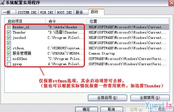 2、点选“启动”选项卡 →在下方主窗口中仅保留“ctfmon”选项 →点确定,立即重新启动。如下图: