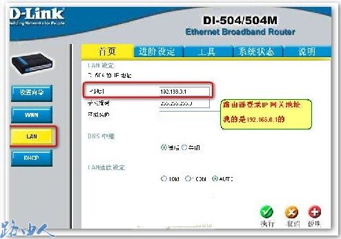 二、对路由器2进行设置,d-link路由默认网关地址是192.168.0,进路由进行管理,如图示: