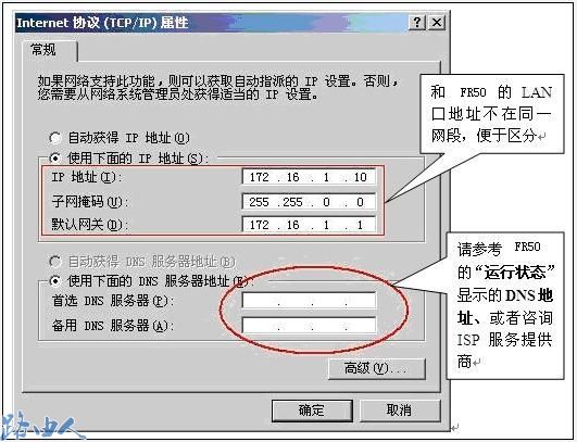 (3)通过无线或者有线方式连接FW54R和电脑,上面两步配置完以后,FW54R就相当于一台无线交换机,所有通过有线或者无线方式连接在FW54R上面的电脑的TCP/IP属性要和FR50保持一致。相当于所有电脑是直接连接在FR50 LAN口下,电脑的TCP/IP属性参数配置如下图所示: