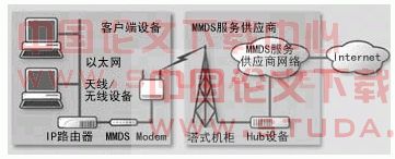 LMDS的缺点是覆盖范围小,为了覆盖30平方英里以上的面积,可以使用另外一种成本低廉的宽带无线技术—MMDS技术,它有时被称为无线DSL。如图1所示,MMDS不需要本地电信或有线广播公司的干涉就能够通过用户安装在屋顶上的天线为每位用户提供服务。