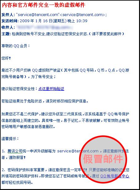 最近有用户举报,收到假冒腾讯公司名义发出的诈骗邮件,欺骗用户到非腾讯官方网站输入密码和密保资料,导致密码及密保相关资料被盗。邮件的大意是:您的号码申诉成功,或者您的号码存在异常,需要用户修改密码、设置验证密保。 盗号者使用非法技术手段摸拟任意发件人的地址(如模拟成腾讯官方邮件地址service@tencent.com),此类虚假邮件具有极高欺骗能力,腾讯公司提醒广大QQ用户注意识别此类虚假邮件。 鼠标右键点击链接,选择“复制快捷方式”,如下图: 方法1(官方验证): 则为腾讯官方网址,该邮件可信。若显示: 则为非腾讯官方链接,若进入相关网址出现提示输入QQ密码等私密信息,请勿相信。若显示: 则为恶意、假冒网址,请勿点击。 方法2(人工识别): 若不是紧跟“/”,则为非官方地址,请注意识别。点击http://service.qq.com/info/5141.html 了解如何识别腾讯网站。 识别方法1(QQ邮箱用户特有) 识别方法2(QQ邮箱用户特有): 温馨提示:假冒邮件样本: