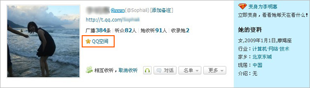 那么,他人访问我的微博时可以看到我的空间入口,如图: