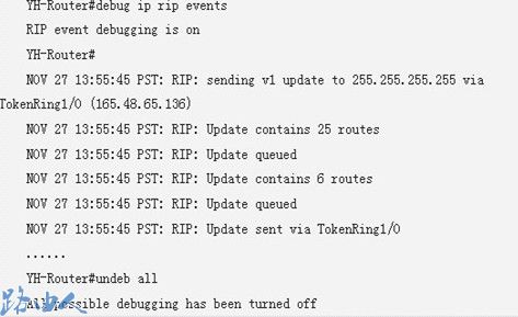 在调试开始时,并没有清空思科路由器表,因为路由器每隔30秒自动进行一次RIP更新,因此不需要强 制更新。与第一个示例中类似,在获得了足够的信息后应该关闭所有的调试。