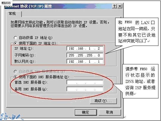 (3)通过无线或者有线方式连接FW54R和电脑,上面两步配置完以后,FW54R就相当于一台无线交换机,所有通过有线或者无线方式连接在FW54R上面的电脑的TCP/IP属性要和FR50保持一致。相当于所有电脑是直接连接在FR50 LAN口下,电脑的TCP/IP属性参数配置如下图所示: