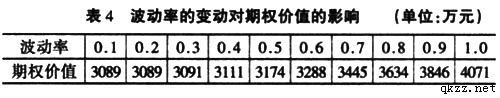 假设出租价格波动率分别为0.1、0.2、0.3、0.4、0.5、0.6、0.7、0.8、0.9、1.0,分析波动率的变动对项目期权价值的影响,具体内容见表4。