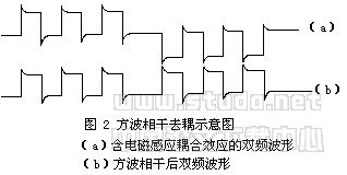 由于电磁感应耦合效应在双频波上的特殊表现形态,可以通过方波相干方法消除它。图2是该方法的示意图,上图为含电磁感应耦合效应的双频波形,下图则为低频方波相干后波形。可见图中上升和下降沿的电磁感应耦合效应强度相等,符号相反,检波积分后互相抵消而激电效应却基本不受影响。这种方法被称为方波相干去耦法,是双频激电中独特的去耦方法。它不仅适用于层状大地模型,当存在二、三维地质体时也同样存立,因而具有广泛的应用前景。据有关专家鉴定,该方法在学术上居国际领先水平。地球物理学报已接受发表这一成果。