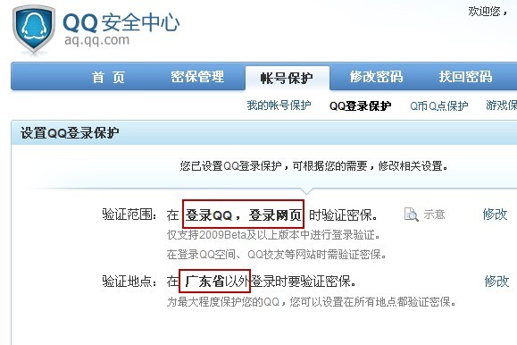 答:QQ登录保护分为2种范围的保护,一种是登录QQ/TM/WebQQ时需要验证密保,一种是登录腾讯网站需要验证密保,例如QQ空间、校友、拍拍等。您可以根据需要选择一种或两种保护。此外,为了减少您验证密保的繁琐,您还可以设置最多2个不需要验证密保的地点,建议您将常用QQ的地点设置为不需要验证密保的地点,同时兼顾方便与安全。
