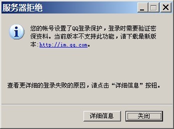 1、QQ2009Beta以前的QQ版本(例如QQ2008)、TM2009Beta以前的TM版本、所有非简体中文版本QQ均不支持登录QQ时验证密保。您在设置QQ登录保护后,登录以上不支持验证密保的版本时,会收到以下提示:您的帐号设置了QQ登录保护,登录时需要验证密保资料。当前版本不支持此功能,请下载最新版本:http://im.qq.com